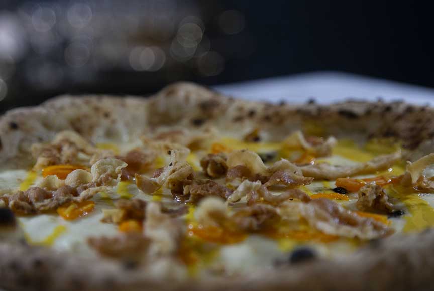 It is not only the Romans who love it, but the whole world is really crazy about the “carbonara” version of the pizza. The pizza we are offering you has marinated egg yolk, crispy Amatrice bacon, Agerola mozzarella, a sprinkling of pecorino Romano DOP, salt and pepper and extra virgin olive oil.